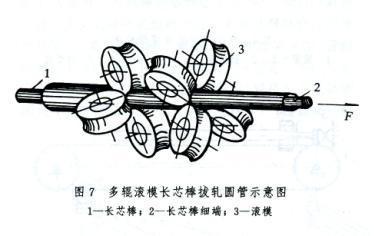 (3)长芯棒滚模拔制圆管工艺(图7)。中国北京科技大学研究成功的多辊滚模长芯棒拔制圆管的过程是:拔制前先将管头缩口,使之与芯棒锥形过渡区相配合以卡住管子。然后插入芯棒,且使长芯棒细端通过滚模。拔制时冷拔机钳口咬住芯棒细端做直线运动,并将管子和芯棒一起从滚模中拉出,实现管材减壁延伸变形,变单纯冷拔法为拔轧结合法。这种方法可获得大的道次变形量,可减少能量消耗,结构简单,管子表面质量好;缺点是脱棒较困难。