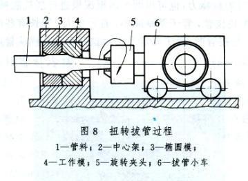 (9)扭转拔管,即在拉拔的同时使管子产生扭转的拔制过程。拔后的管子平直度好,可以省略矫直工序。拔制过程如图8所示。管料1拔制时通过置于中心架2上的椭圆模3(用于防止管子转动)和工作模4。借助于拔管小车6上的夹头5的旋转对出变形区后的管子施加扭矩,使它产生扭转,管子因扭转而防止了弯曲。