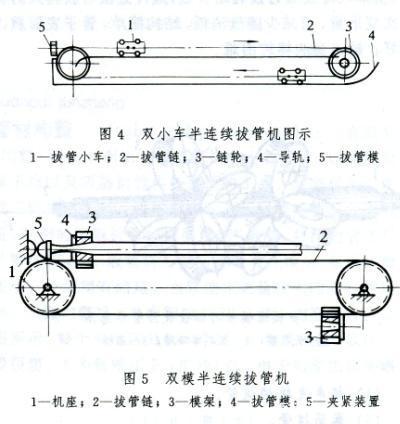 (2)半连续和连续拔管。各种直线式拔管机都是间歇工作的,拔完一根管后需等待小车返回才能拔下一根管。因此研究出半连续和连续式拔管。半连续冷拔管有两种形式。一种是采用双移动拔管小车(图4),拔管小车固定在运动链上,并沿具有一定形状的导轨运行。上层的拔管小车把前一根管子拔出后,下层的拔管小车到达中心架前并夹住后一根管进行拔制。另一种是拔制时移动双拔管模的半连续拔管机,如图5所示。