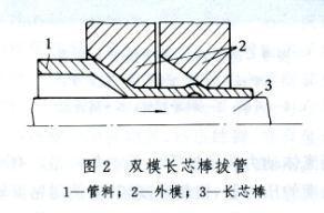 (4)长芯棒拔管,拔管时由于芯棒同管子一起运动,基本上消除了芯捧上的摩擦阻力,因而可降低拔制力和增加道次变形量;芯棒运动还可降低管子内表面粗糙度;长芯棒拔管的缺点是对芯棒要求严格,且拔后要脱棒。脱棒的方法有两种:一种是在斜轧机上将管子和芯棒一起展轧,使管子少量扩径,之后在抽棒机上将芯棒抽出;另一种是利用双模拔制来进行抽芯棒前的扩径(见图2),后一个模子是附加模,通过附加模时管壁只有很小的变形量,管子直径稍有扩大,可降低脱棒时的脱棒力;也可用两个四辊滚模进行展轧脱棒。