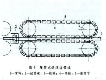 连续式拔管机有履带式的(图6)和双小车往复运动式的。履带式拔管机由前端装有拔管模的几个机架组成。机架上下两侧都装有环链,环链轴上装着履带节,用来压紧管子强迫送入拔管模。这种连续式拔管机可进行无芯棒和长芯棒拔制,与普通拔管机相比可提高产量3倍;存在的问题是在无芯棒拔制时易产生纵向壁厚不均,使用固定模阻力大、能耗高、产品表面质量较差以及脱棒困难。此外还有双小车往复运动的连续拔管,用于无芯棒拔制,见连焊连拔精密管。